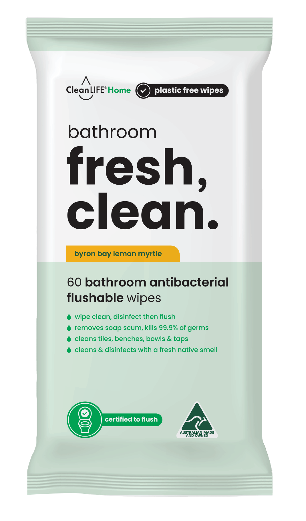 CleanLIFE bathroom fresh, clean. wipes are an antibacterial flushable cleaning wipe designed for bathroom and wet areas that provides an effective clean on benches, tiles, porcelain and stainless surfaces. Simply wipe, clean, disinfect and flush after use - you can also place these into a green bin. bathroom fresh, clean. leaves surfaces with a native fresh smell of Byron Bay lemon myrtle.