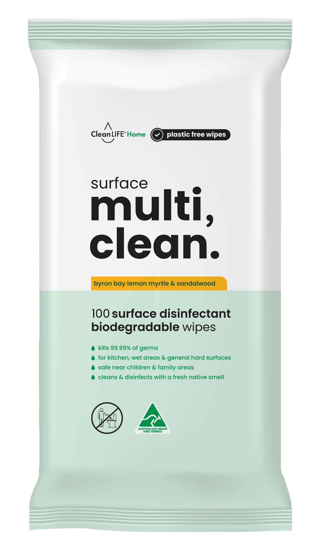 surface multi, clean. are everyday general cleansing wipes, perfect for tackling tough messes in kitchens, wet areas on hard surfaces. Removes food residues and grease, dirt, and general grime, killing 99.99% of germs to keep surfaces clean and free of common bacteria. surface multi, clean. leaves a native smell of Byron Bay lemon myrtle and sandalwood.