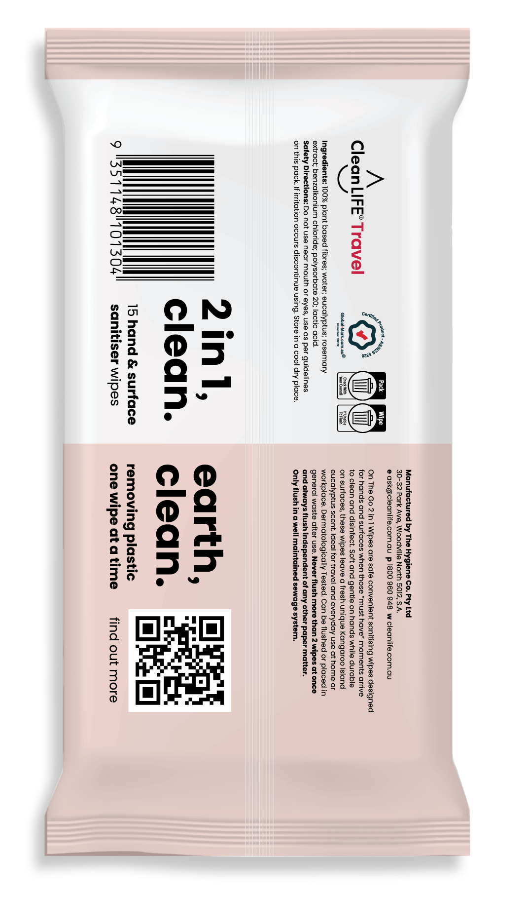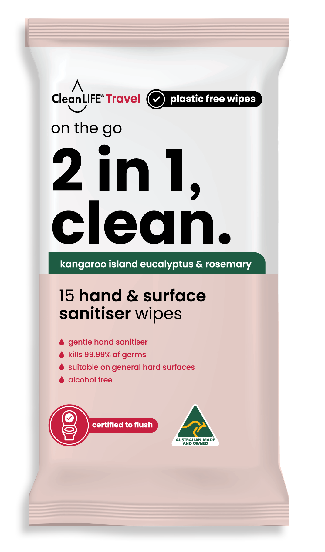 On The Go 2 in 1 Wipes are safe convenient sanitising wipes designed for hands and surfaces when those "must have" moments arrive to clean and disinfect. Soft and gentle on hands while durable on surfaces, these wipes leave a fresh unique Kangaroo Island eucalyptus scent. Ideal for travel and everyday use at home or workplace. Dermatologically Tested. Can be flushed or placed in general waste after use.