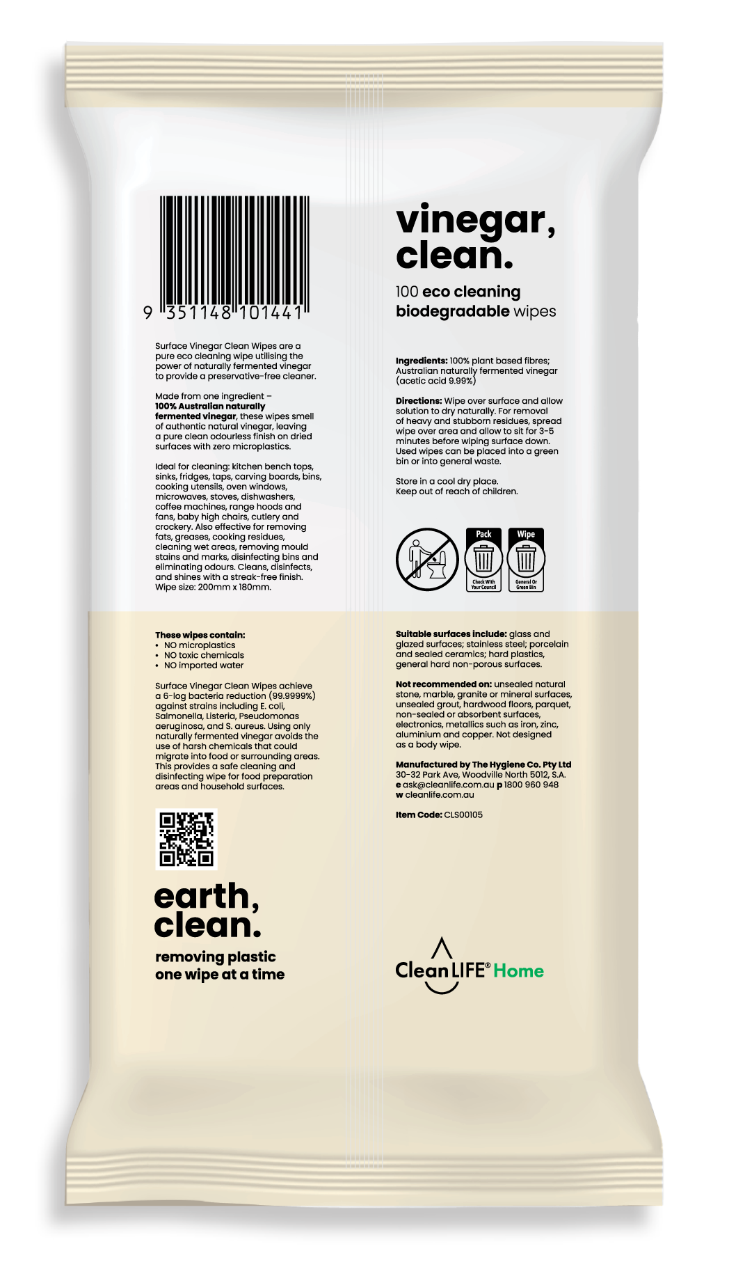 Made from one ingredient - 100% Australian naturally fermented vinegar, these wipes smell of authentic natural vinegar, leaving a pure clean odourless finish on dried surfaces with zero microplastics.
